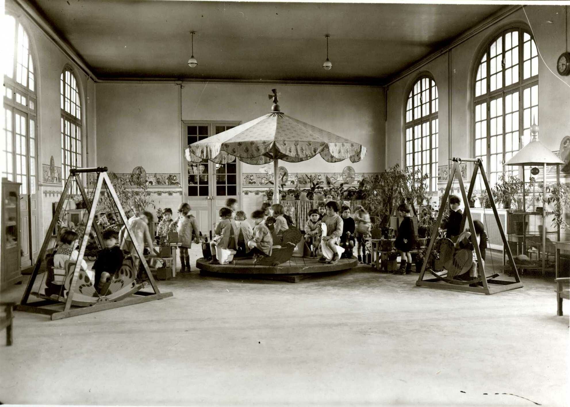 Toboggans, balancelles et manèges étaient fabriqués par la société Le Jouet Moderne qui employait des personnes mutilées pendant la Première Guerre mondiale dans ses ateliers de l’Ile de Puteaux. Leur production s’est diffusée dans les écoles des cités-jardins d’Ile-de-France, notamment à Argenteuil.