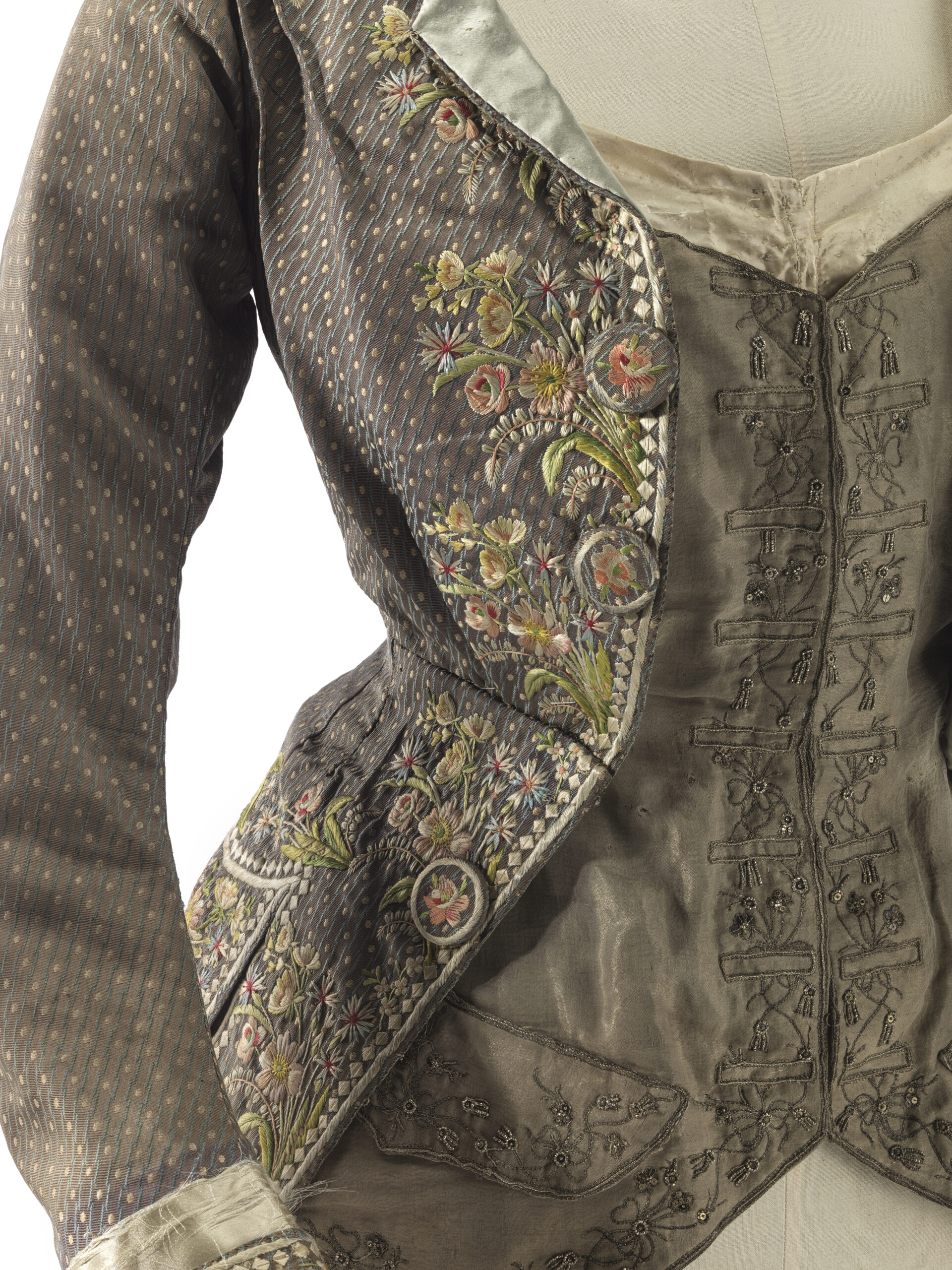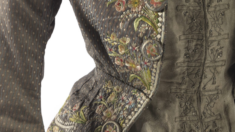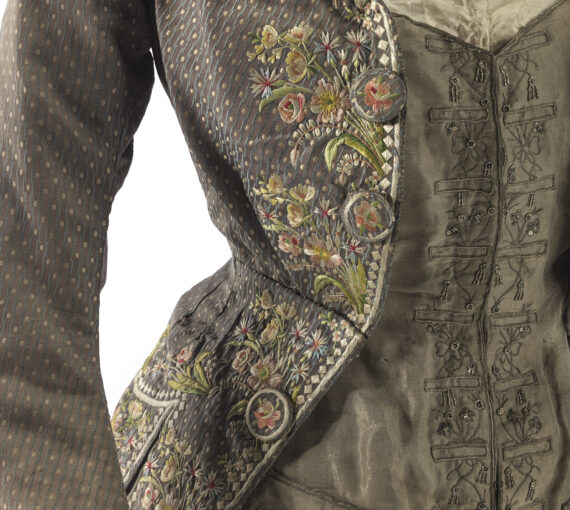 Charles-Frederick Worth était déjà un adepte avant l’heure de l’up-cycling/surcyclage en réutilisant notamment des tissus anciens pour proposer des modèles modernes pour l’époque, à l’image d’une veste pour un bal travesti conçue à partir d’un vêtement de gentilhomme de la fin du XVIIIe siècle.