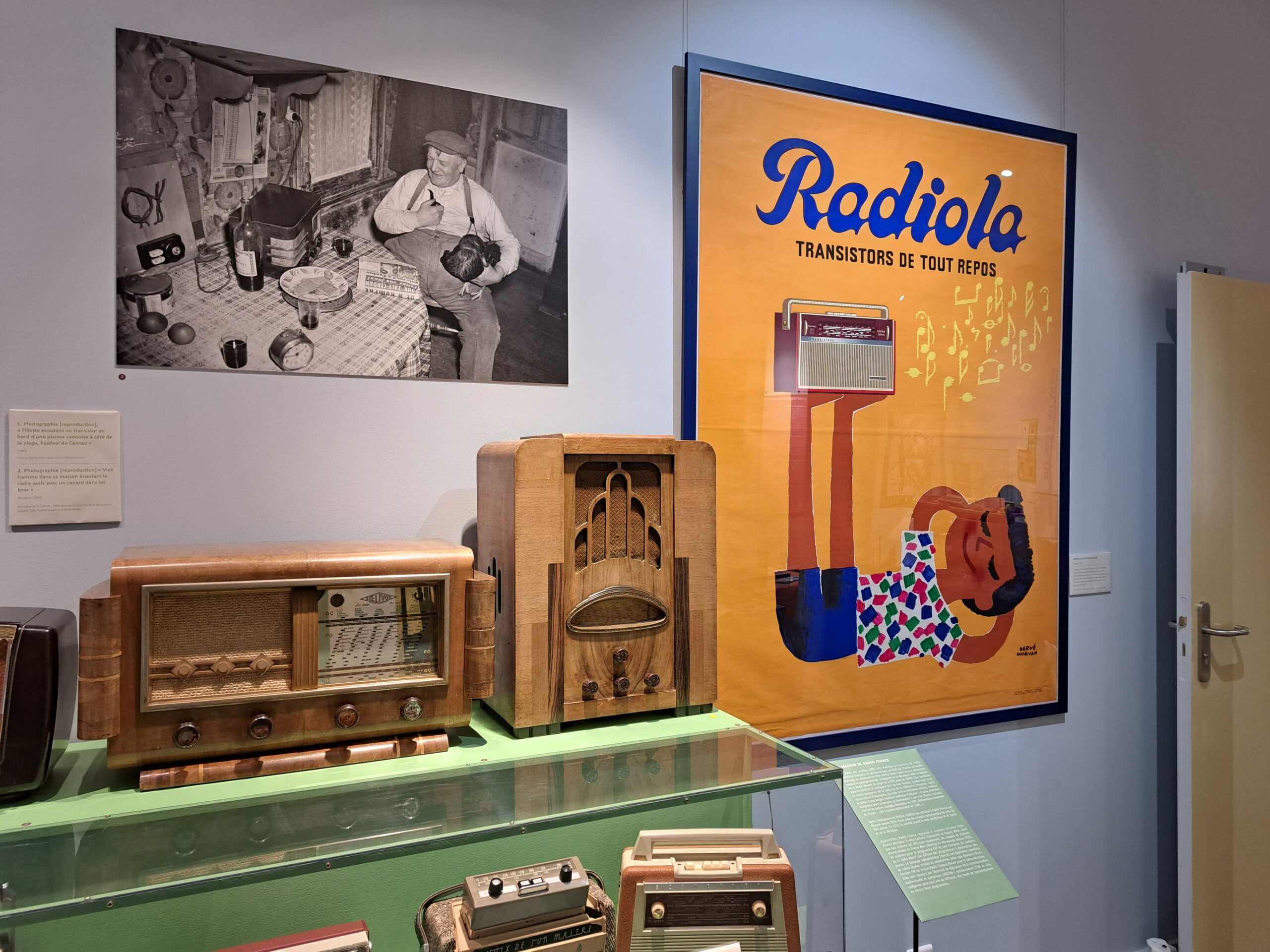 Pour cette exposition, le MUS a prêté deux affiches publicitaires de la marque Radiola « Transistors de tout repos » (inv. 2009.1.53) et « Maître de la télévision couleurs » (inv. 2009.1.54) ainsi que son mythique téléviseur Pamplemousse (inv. 2009.1.45) !
