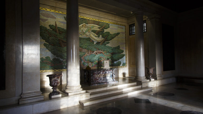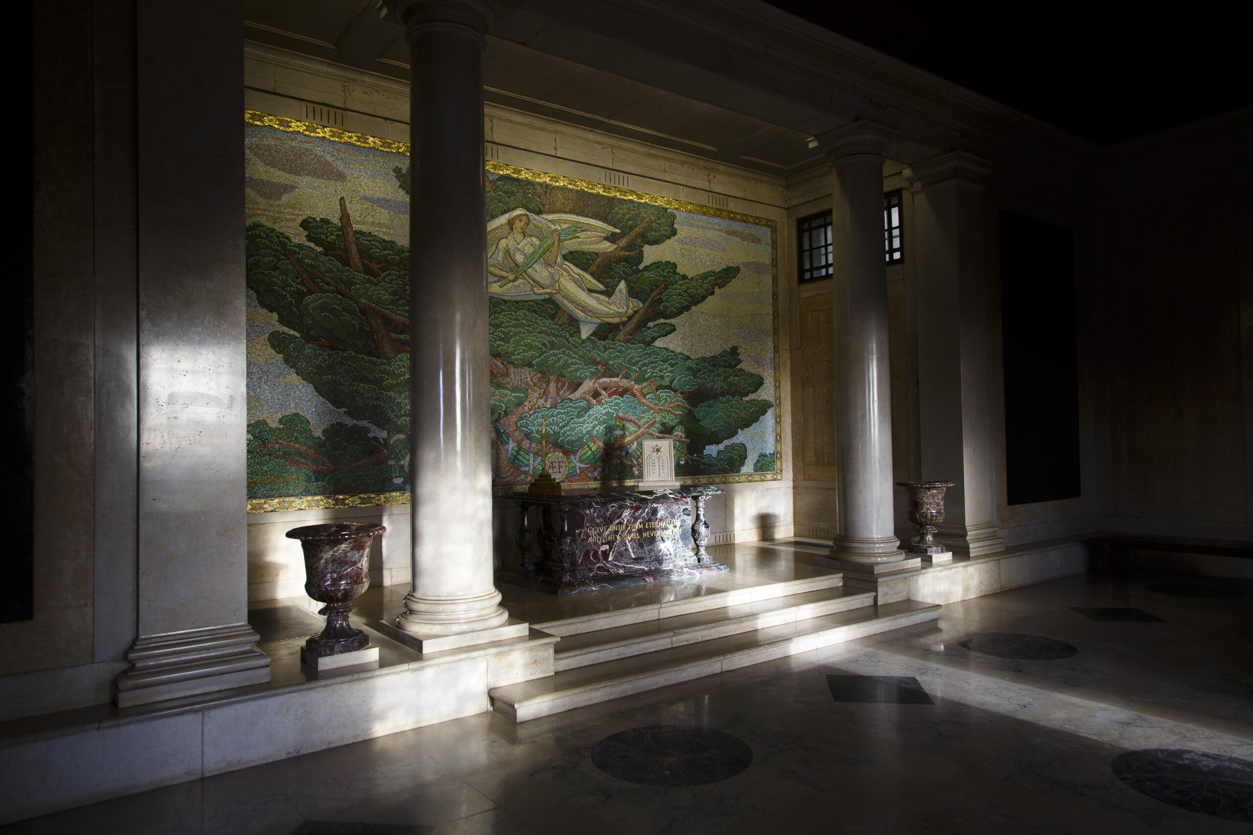 La fresque en mosaïque derrière l’autel, La Paix, est l’œuvre de Barry Faulkner (1881-1966).